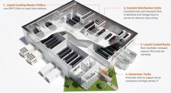 因为目前,大多数数据中心使用风扇循环空气以降低温度。但功能更强大的芯片产生的热量更多,会超过目前这种冷却系统的极限。一种解决办法是,在服务器中通过管道运行液体冷却剂,来吸收热量,只有配套了更高效的冷却系统,才能让数据中心的服务器可以排列得更紧密,以满足新需求。当然,液冷系统的成本是风冷系统的三到四倍。
