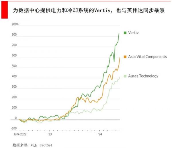 一家叫做Vertiv Holdings的公司,为数据中心同时提供电力和冷却系统,自2022年底ChatGPT发布以来,其股价已升近700%。Vertiv上一季度的订单量也同比增长了60%。截至今年3月底,订单积压已达到创纪录的63亿美元。该公司约三分之一的销售来自数据中心的散热管理。