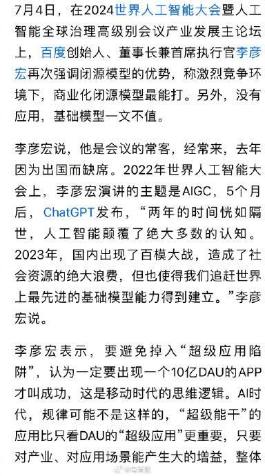 独家丨李彦宏内部讲话曝光:李彦宏称大模型开源意义不大,百度绝不抢开发者饭碗