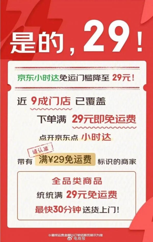 4月份,京东即时零售推出了“满29元免运费”的优惠活动,该服务现已广泛覆盖平台近九成门店。数据显示,下调免运费门槛后,京东小时达服务的下单用户数量实现了环比25%的增长。
