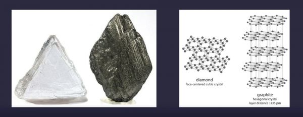 钻石(左)和石墨(右)差别在于碳原子的排布方式不同