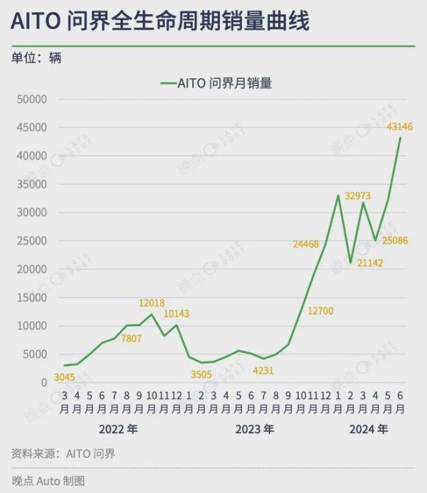 做了五年汽车业务的华为,最成功的单一项目毫无疑问是问界。华为现在按月公布智选车模式销量(鸿蒙智行),今年上半年是 194207 辆,问界占 154074 辆。单 6 月,问界交付了创纪录的 43146 辆新车,排全国第四。