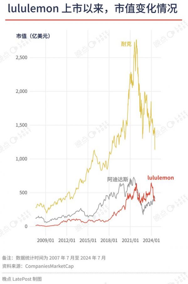 权威评级机构晨星的一位分析师也说,“他想说什么说什么,但是数字表明公司不需要他”。2007 年 lululemon 上市,近 15 年股价翻了 50 倍,2022 年市值超越阿迪达斯,成为仅次于耐克的全球第二大运动品牌。