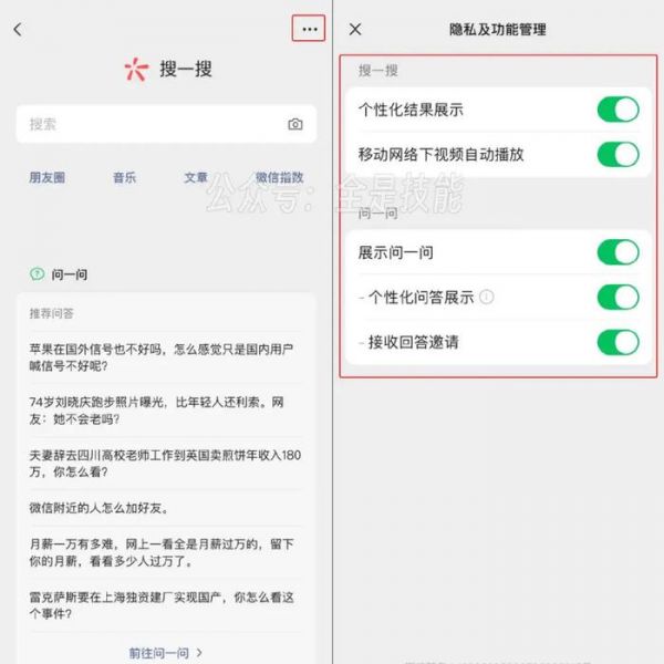 微信最新版中,在“搜一搜”页面点击右上角“···”时,其中对搜一搜的功能管理中新增了“移动网络下视频自动播放”的开关。同时“问一问”也新增了展示开关。