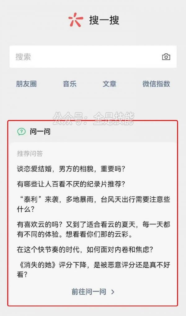 在后来的更新中,微信将“问一问”和“搜索发现”两个功能合并,问一问升级为“文字列表”的展示形式,提供了一些推荐问答。