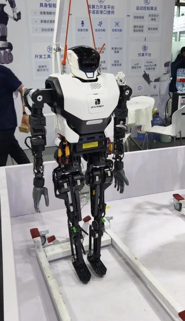 还有国内首款搭载鸿蒙操作系统的全尺寸人形机器人乐聚“Kvavo”,其不仅能多地形行走,还具备跳跃能力。现场人员说,价格预估在60万——80万元之间。