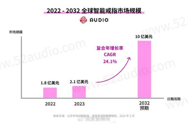三星作为全球知名消费电子品牌,它的入局将让更多的人了解并尝试智能戒指这一全新的穿戴品类。我爱音频网对智能戒指市场作出过详细解读,该品类在2023年的全球市场规模达 2.1 亿美元,较 2022 年全年同比增长 16.7%,对比智能手机、智能手表等其他主流消费电子品类,增长势头相当强劲。预计在2024-2032年期间,智能戒指市场全球复合年增长率将达24.1%。2032年市场规模预计达10亿美元,可谓十分乐观。