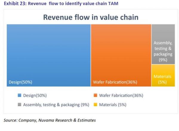 根据Nuvama数据显示,在半导体整个价值链中,芯片设计占到了50%,晶圆制造占到了36%,封装和材料分别占9%和5%。