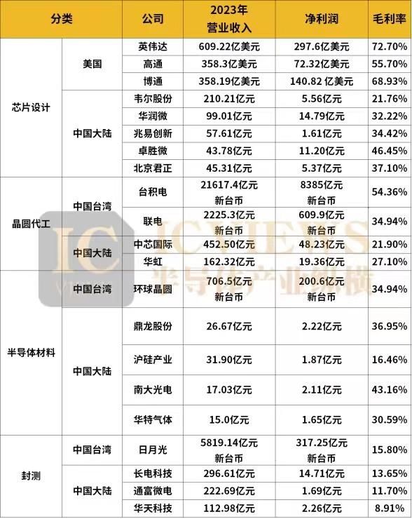 上表透露的信息也对这一数据做了印证。在人工智能浪潮中赚的盆满钵满的英伟达在2023年的毛利率高达72.7%;美国两大科技巨头高通和博通在2023年的净利润也均超过50%,分别为55.7%和68.93%。