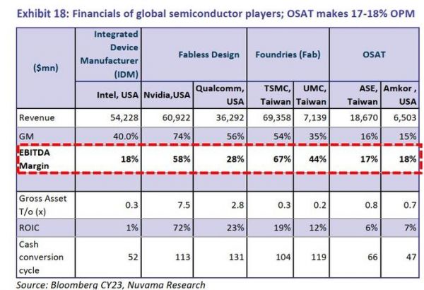 再看投入资本回报率(ROIC),英伟达的投入资本回报率是最高的达72%,其次为高通23%、台积电19%、联电12%、安靠7%、日月光6%,英特尔1%。