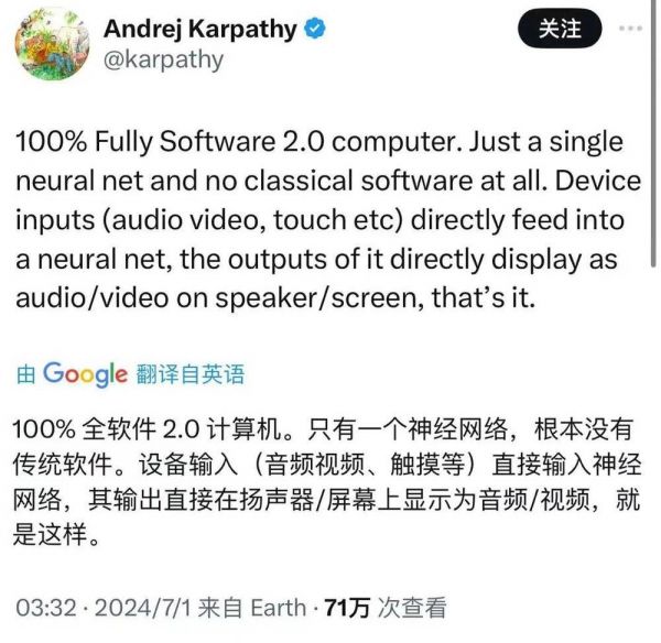 前两天,知名人工智能专家、OpenAI的联合创始人Andrej Karpathy提出了一个革命性的未来计算机的构想:完全由神经网络驱动的计算机,不再依赖传统的软件代码。