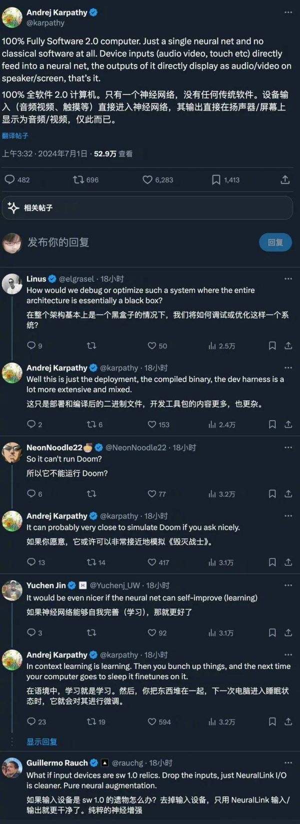 这一概念的提出,引发了网友广泛的讨论和巨大关注,奶茶觉得这个设想看上去会不会太宏观而且不切实际,于是查看了Karpathy在帖子下的回复,试图找到支撑性的证据:
