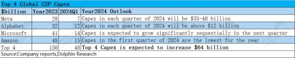 在GPT等需求的带动下,主流云厂商纷纷都提升了自身的资本开支。2023年四大云厂商(Meta、谷歌、微软和亚马逊)的资本开支总计1500亿美元。结合一季度各公司管理层交流情况,四家公司的资本开支在今年都有望提升,海豚君预期4家公司的合计资本开支有望提升640亿美元,同比增加42%。