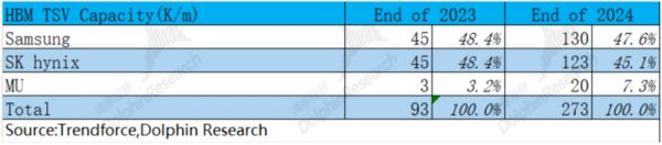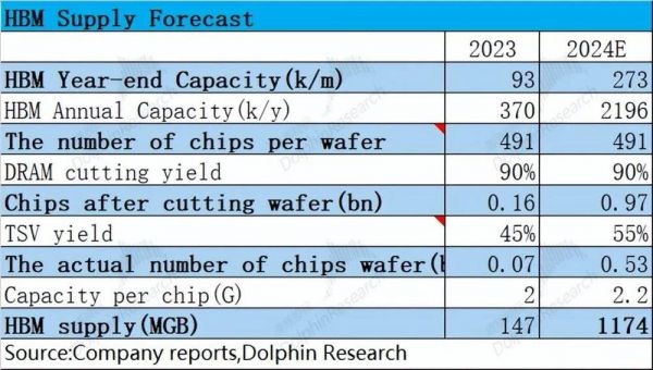 海豚君可以测算出,HBM的供给端有望从2023年的147MGB,提升至2024年的1174MGB,是去年同期的接近8倍。如此大的提升,主要得益于大规模的产能扩张、TSV良率的提升和单颗粒的容量增加。