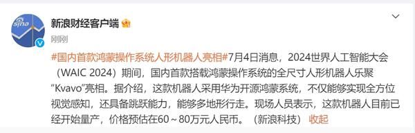 国内首款鸿蒙人形机器人亮相!售价预估60-80万元