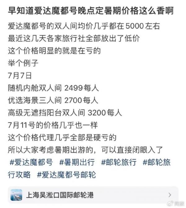 近期,爱达魔都号销售渠道由于落水事件雪上加霜。这仅仅是明面上短期的“黑天鹅”,而暗地里,爱达魔都号邮轮还面临另外一场风波。目前社交平台上,诸多爱达魔都号邮轮代理商纷纷打出“暑期邮轮价格大跳水,建议大家见好就收”的广告语。