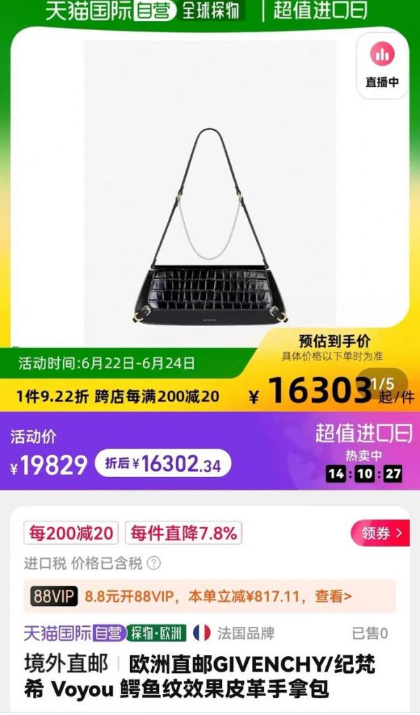 巴黎世家的鳄鱼纹沙漏包,原价高达17200元,然而在天猫国际官方旗舰店中的售价仅为10899元,接近六折。同样引人注目的还有范思哲的鳄鱼纹小号手袋,原价22400元,但预估到手价仅为16300元,省了6000元。整体而言,这些产品的平均折扣幅度大约在五折到七折区间。而且购买部分商品时,顾客还可以享受12期或24期的免息支付服务,这一优惠力度确实是前所未有的。