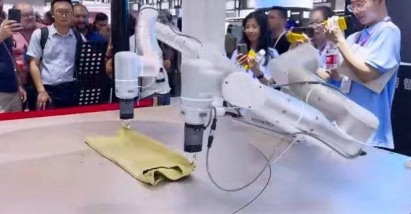 除此之外,穹彻智能也在现场展示了能够让机器人“叠被子”的技能AnyFold。穹彻智能成立于2023年,由“老牌四小龙”Flexiv非夕科技战略孵化,长江学者、2023年“科学探索奖”获奖人卢策吾教授担任联合创始人兼CEO。穹彻智能告诉虎嗅,这项技能由他们在WAIC上推出的具身智能大模型——穹彻具身大脑Noematrix Brain实现,重点聚焦对操作物理常识和智能体行为决策的联合训练。