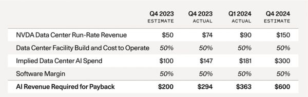 去年,Nvidia的数据中心硬件收入达到475亿美元(其中大部分硬件是用于AI和HPC应用的计算GPU)。AWS、Google、Meta、Microsoft等公司在2023年为OpenAI的ChatGPT等应用在其AI基础设施上投入了巨额资金。然而,他们能赚回这笔投资吗?David Cahn认为,这可能意味着我们正在目睹金融泡沫的增长。