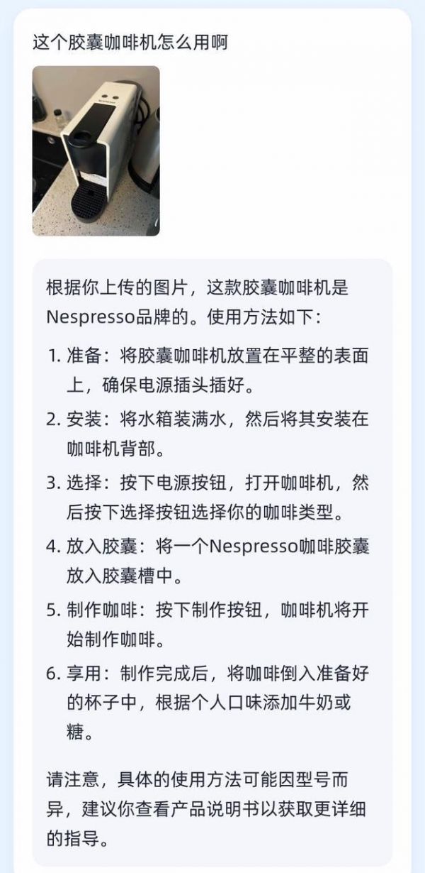 尤其是跃问多模态内容理解能力的功能,不仅能将复杂的文本信息转化为直观的长图,智能提取文档中的关键信息,以图文并茂的形式呈现,还能直接理解现实世界,并给出实用的建议和帮助,比如出差住酒店不知道怎么用咖啡机,就可以直接找跃问来解决。