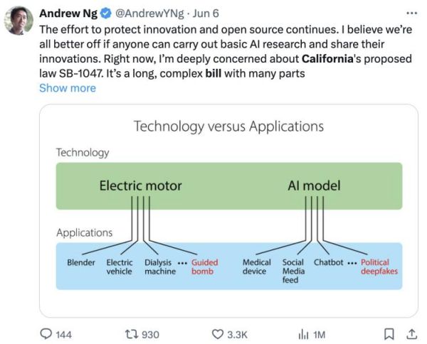 这也是SB-1047法案的根本缺陷 ——它不是专注于滥用和恶意用户,反而试图监管模型和基础设施,把如此繁重的负担放在了初创公司、创始人和工程师身上。DeepLearning.AI创始人吴恩达在X撰写长文,称“安全性是应用程序的属性,而不是技术或模型的属性….如果有机会,我希望您能加入发声,共同反对这一法案。”