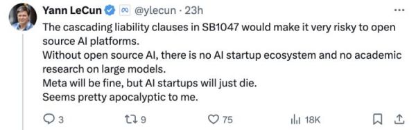 Yann LeCun解释说,“SB-1047 的级联责任制将使开源 AI 平台面临极大风险。没有开源 AI,就没有 AI 初创公司生态系统,也没有大模型的学术研究。Meta 会没事,但 AI 初创公司将会死亡。在我看来,这才是末日景象。”