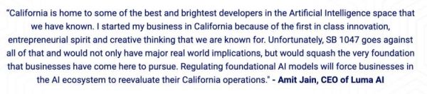 Luma AI CEO Amit Jain说,“加州是我们所知最优秀、最聪明的AI开发者聚集地。我在加州创业是因为这里一流的创新精神和创造性思维。不幸的是,SB-1047法案违背了这一切,不仅会带来重大现实影响,还会破坏初创公司来此地奋斗的目标。对基础模型的监管将迫使AI生态系统中的企业重新评估其在加州的运营。”