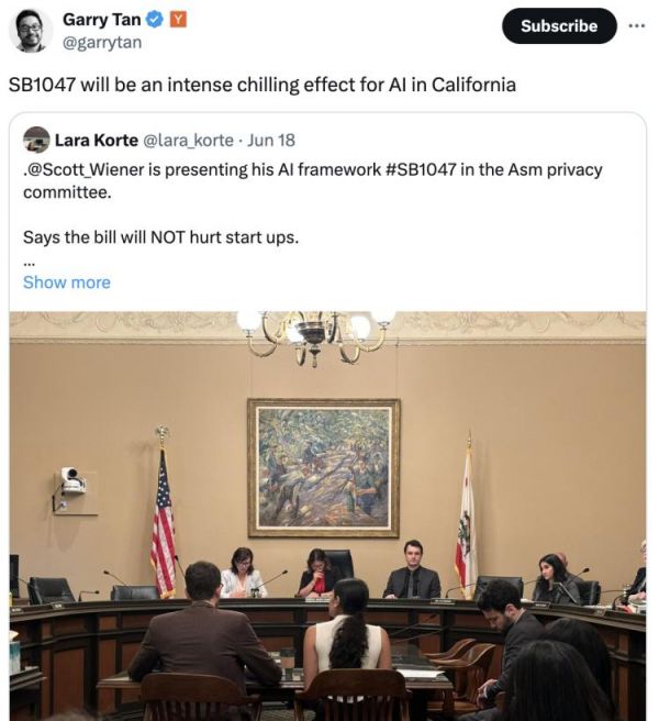 Y Combinator掌门人Gary Tan表示,“SB-1047将对加州的 AI 发展产生强烈的寒蝉效应。”