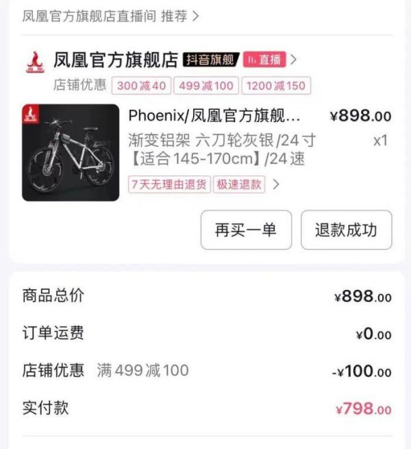 图:网友在直播间购买的凤凰自行车订单 来源:网友供图该网友表示,让他恼火的不仅是商家少寄了零件,爆了胎,而且自行车的轮胎装好后,根本转不动,刹车系统也有问题。