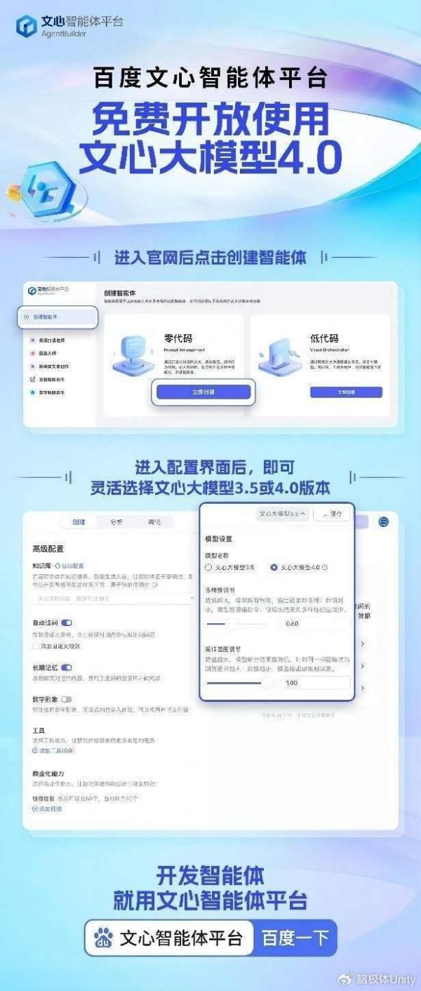 面向未来,每一位专家的学识,千行百业里每一个需求的满足,都可能会是一个智能体。智能体领域的布局,也将成为科技企业在大模型之后必须重点布局的AI战略高地。比如说,百度已经形成了比较完善的智能体布局,并且在细分领域跑出代表性案例,初步开始探索商业模式。目前在百度文心智能体平台上,已有16万多名开发者和超5万家企业入驻,覆盖了100多个应用场景。目前该平台免费开放文心大模型4.0,开发者制作智能体时可灵活选择文心大模型3.5或4.0版本。