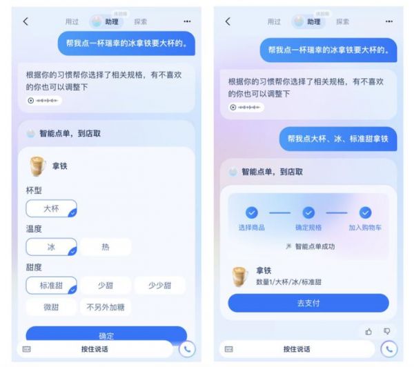 以支付宝智能助理正在测试的“智能点单”功能举例:当用户说出“请给我点一杯星巴克的大杯冰拿铁”,大模型先让AI具有屏幕感知能力,能“看到”小程序页面,再通过仿真执行能力,快速完成所有过去需要用户点击的步骤,用户确认并付款后,就能到附近的线下门店取咖啡了。
