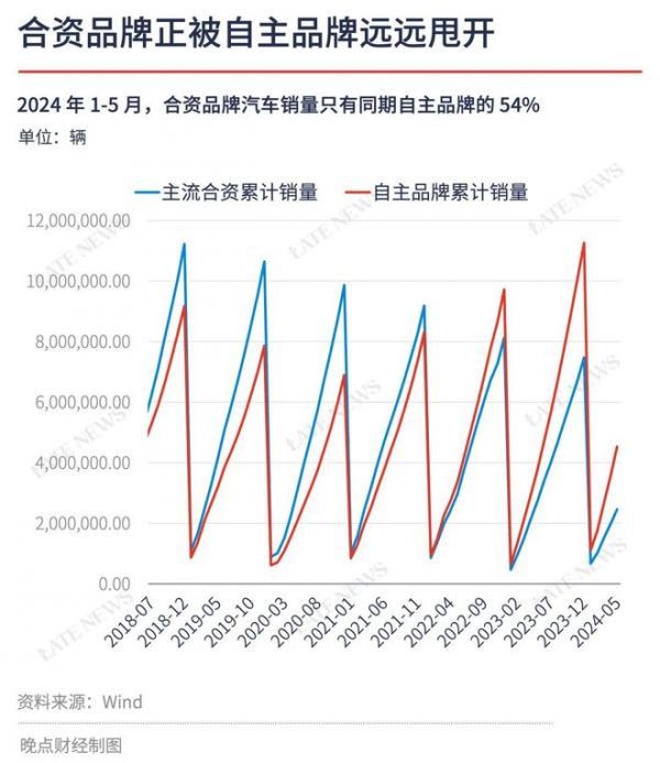 据 Wind,今年前五个月国内主流合资品牌乘用车 245.7 万辆的累计销售规模不仅只有同期自主品牌的 54%,甚至低于受疫情影响较大的 2020 年和 2022 年同期。