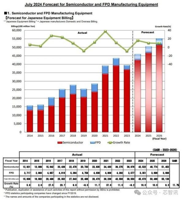 受益于AI 热潮所带动的AI芯片和高带宽内存(HBM)需求的影响,日本半导体制造设备协会(SEAJ)近日上修了日本制造的半导体设备的销售额预期,预计2024年度(2024年4月-2025年3月)日本半导体设备销售额将首度突破4万亿日元,同比增长15.0%至42,522亿日元(约合人民币1,920.3亿元),相比之前的预期40,348亿日元上调了约5.4%,创下历史新高纪录。并且,预计2026年度销售额将进一步突破5万亿日元。