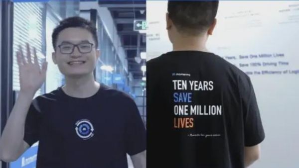 Momenta 文化衫的正面(一个飞轮两条腿)与背面(目前是 “十年拯救百万生命”)。有些 Momenta 工程师会开玩笑说自己在飞轮公司上班。