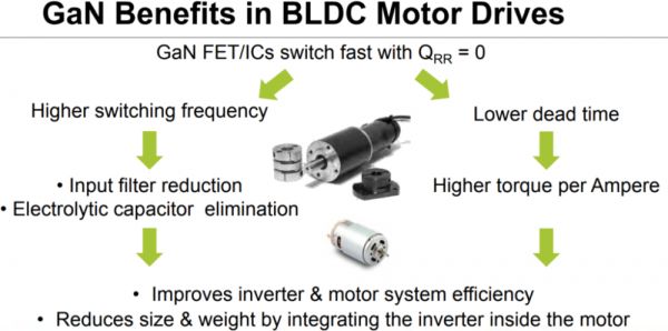 氮化镓(GaN)晶体管和集成电路能够在不显著增加损耗的情况下以更高频率运行,相比于基于硅的设备,它们能够显著降低成本、噪音、尺寸和重量。也正因此,GaN在电机驱动领域展现出了巨大的潜力。