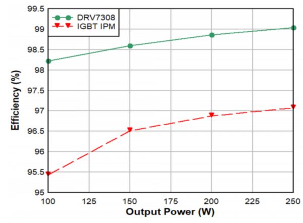 高效率:GaN器件的导通损耗和开关损耗显著低于传统硅器件。例如,TI的DRV7308 GaN IPM可以将逆变器效率提高到99%以上,而传统的IGBT解决方案只能达到97%。
