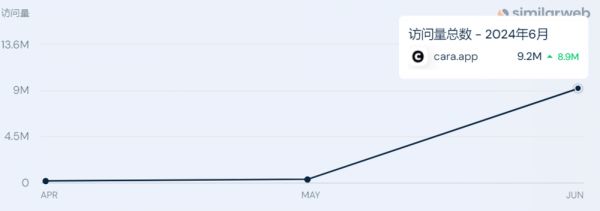 离开Meta后,他们很快找到了一个没有AI的地方——Cara。在很短的时间内,大量用户纷纷涌入Cara。除了移动端下载量暴涨,网站流量也出现剧增。据similarweb数据,6月前Cara的网站访问量屈指可数,到了6月猛增到了920万。