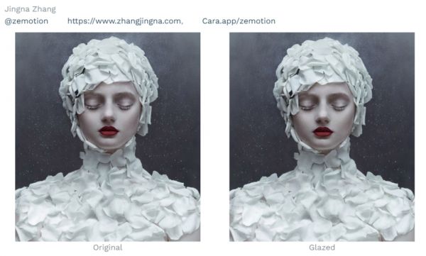 当艺术家在Cara平台发布作品时,Ta可以勾选“我要保护这张图”,网站会给作品“上一层釉”,而这个操作并不会影响画作的肉眼效果。而这道工序背后暗含着Cara的一个秘密武器——Glaze技术。