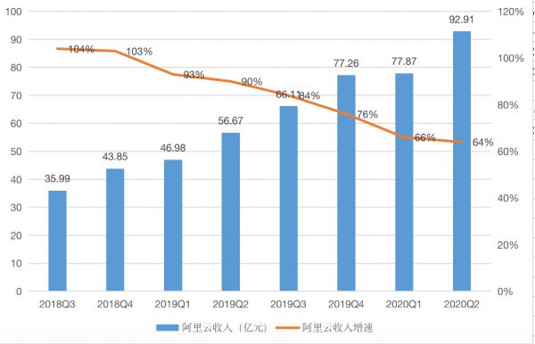 财报显示,本财季,云计算业务季度营收92.91亿,比去年同期净增36.24亿元,增速达到64%。对比上一季度营收77.87亿,环比增长19.3%。这一增速高于此前亚马逊和微软云业务35%和59%的增速。超出市场预期。