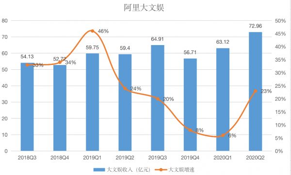 数据显示,阿里的数字媒体与娱乐业务营收72.96亿元,去年同期为5.94亿元,同比增长23%。增长的主要原因是2019年3月起阿里影业的并表。
