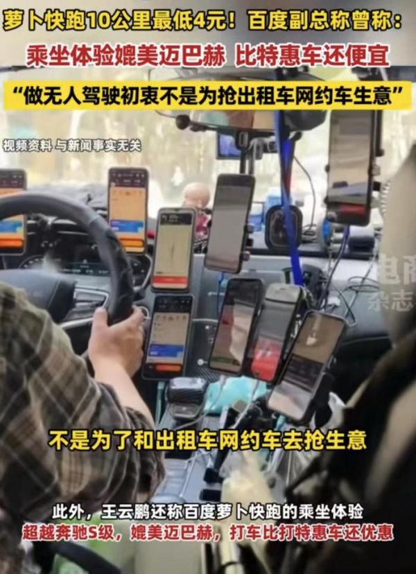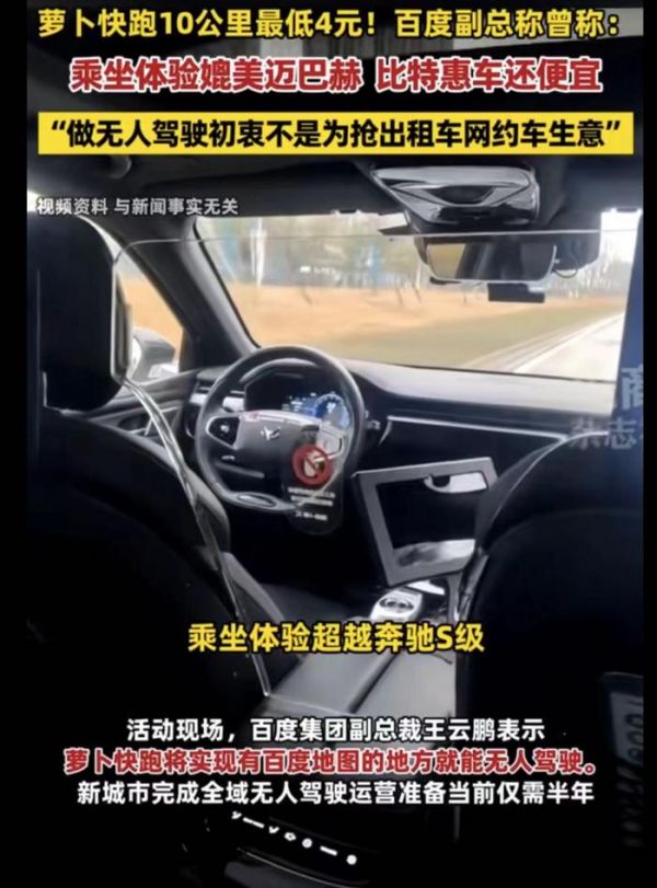 从这位副总裁的话可以看到,他话还是说得有一点点冲突的。又说不是想抢网约车司机的生意,但价格又要比人家弄得便宜。现在那萝卜快跑十公里就收个几块钱,那真的那些网约车司机看了都摇头,实在是没办法去跟你竞争。而且百度这样的大公司如果真要打价格战,那真的那些网约车司机是没办法的。