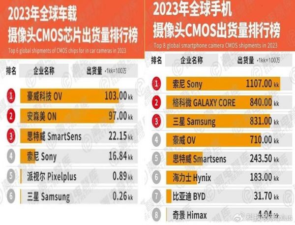 上图是2023年全球车载CMOS芯片排行榜,以及手机摄像头CMOS芯片出货量排行榜。