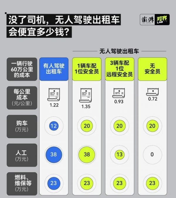 据澎湃新闻报道,广汽资本在去年发布过一个调查,显示在不配备任何安全员的前提下,前者的每公里成本是 0.72 元,而有人驾驶的电车是 1.22 元。而如果我们按照《自动驾驶汽车运输安全服务指南(试行)》中的要求,远程安全员应符合人车比不得低于 1:3 来做个粗换算,那无人驾驶出租车的成本至少也要 0.93 元每公里。