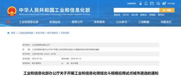 《科创板日报》7月12日讯今日,工信部官网发布关于开展工业和信息化领域北斗规模应用试点城市遴选的通知。《通知》提出,为促进北斗产业发展,加快北斗应用落地,拓展北斗应用广度和深度,工信部拟遴选一批有条件、有基础的城市(含直辖市所辖区县,以下统称城市),开展北斗规模应用试点工作(以下简称试点工作)。