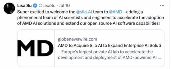 对此,AMD董事会主席及CEO苏姿丰在社交平台表达了兴奋之情:“非常高兴Silo AI团队加入AMD,让AMD增添了一支卓越的AI科学家和工程师团队。”
