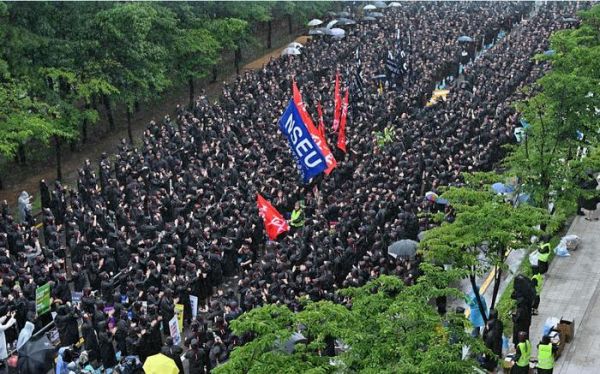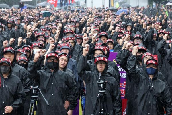 7月8日,韩国京畿道华城市,三星电子华城工厂正门前,三星电子下属最大工会组织“全国三星电子工会”发动总罢工动员大会,六千余人冒雨参加。