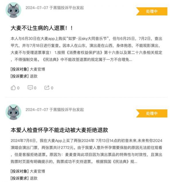 盐财经记者梳理发现,截至7月7日,在黑猫投诉平台上,消费者针对大麦的累计投诉达49348条,近30天的投诉量就达2196条,投诉内容多指向“退票手续费高”“退票退款难”“强制消费、拒绝退票”等问题。