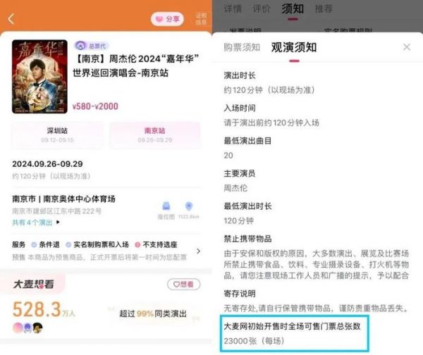 以2024年9月周杰伦演唱会南京站为例,大麦网显示初始开售时全场可售门票总张数为23000张(每场)/图源:大麦App截图