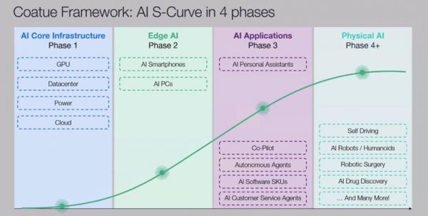 今年三月,美国一家著名对冲基金在发布的一份报告中指出了AI发展的四个阶段。目前我们还处于专注于技术设施建设的第一阶段。即将进入的第二阶段的核心特征是使手机、电脑等设备具备AI能力。第三阶段将会演变成每个人都拥有自己独有的AI助手。第四阶段则包括自动驾驶、AI机器人等更加复杂的应用场景。我把这分为相对确定的当下和充满想象力的远方。