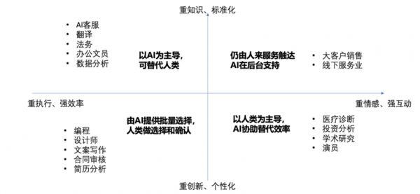 第二象限最值得大家关注,这个领域的特点就是知识结构标准化、任务衡量信息化,非常适合大模型的应用。如果你的工作场景涉及这些,可以考虑用AI来主导替代传统方法。下面的象限尽管数据非常分散,但AI可以极大地提升创意生产效率,辅助我们生成多种可能性。
